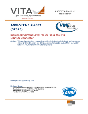 Increased Connector Current Level: This standard describes increased current levels, test methods, test data and compliance criteria for 3-row DIN and 5-row DIN connectors when used in VME, VME64 and VME64 Extension P1/J1 and P2/J2 pin out arrangements.