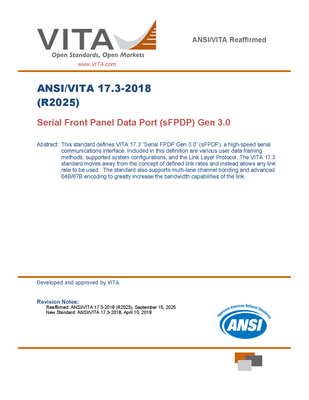 This document describes an open standard for the third generation Serial FPDP, a high-speed low-latency serial communications protocol for use in high-speed data transfer applications. As the name implies, it is directly related to Standard Front Panel Data Port (FPDP), deriving its serial protocol from the defined protocol and control signals of FPDP. Although some recommended industry standard configurations are encouraged in Chapter 10, VITA 17.3 standard moves away from the concept of defined link rates and instead allows any link rate to be used. The VITA 17.3 standard also supports multi-lane channel bonding and advanced 64B/67B encoding to greatly increase the bandwidth capabilities of the link.