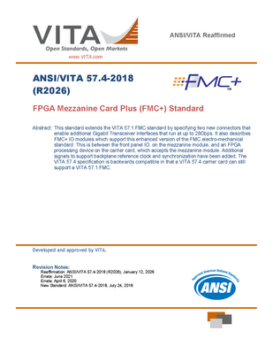 FPGA Mezzanine Card Plus (FMC+) Standard: This standard extends the VITA 57.1 FMC standard by specifying two new connectors that enable additional Gigabit Transceiver interfaces that run at up to 28Gbps. It also describes FMC+ IO modules which support this enhanced version of the FMC electro-mechanical standard. This is between the front panel IO, on the mezzanine module, and an FPGA processing device on the carrier card, which accepts the mezzanine module. Additional signals to support backplane reference clock and synchronization have been added. The VITA 57.4 specification is backwards compatible in that a VITA 57.4 carrier card can still support a VITA 57.1 FMC.