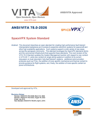 SpaceVPX Systems standard: This document describes an open standard for creating high performance fault tolerant interoperable backplanes and modules to assemble electronic systems for spacecraft and other high availability applications. Such systems support a wide variety of use cases across the aerospace community. This standard leverages the OpenVPX standards family and the commercial infrastructure that supports these standards. This revision adds additional profiles, additional communication protocols (such as Ethernet), higher speed copper connectors, and an updated naming methodology for Slot and Module Profiles.